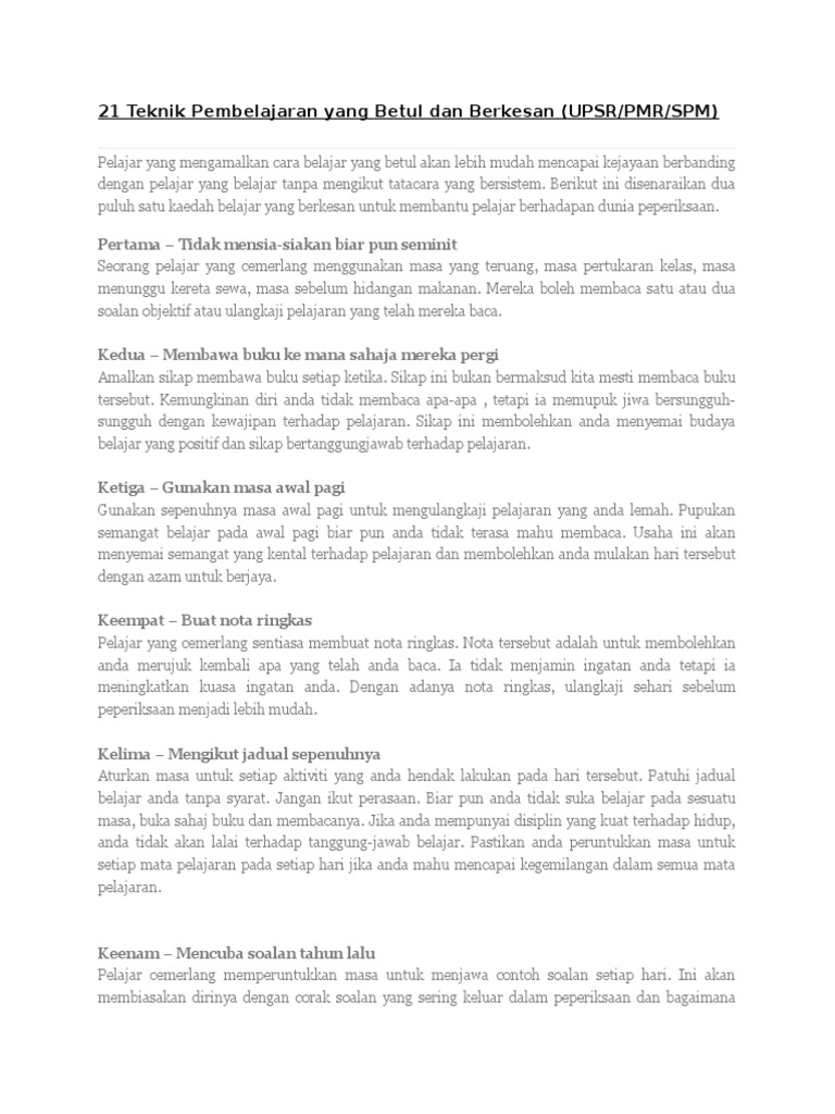 Inginkan kaedah dan cara belajar yang efektif? Agihkan waktu yang cukup untuk tidur, makan dan rekreasi. Pelajar yang mengamalkan cara belajar yang betul akan lebih mudah mencapai kejayaan berbanding dengan pelajar yang belajar tanpa mengikut tatacara yang berikut ini disenaraikan 21 kaedah belajar yang berkesan untuk membantu pelajar berhadapan dunia peperiksaan. Ingin belajar dengan lebih berkesan. Cara buat jadual belajar yang mudah & berkesan | ramai pelajar tanya soalan, bagaimana nak buat jadual belajar yang berkesan?