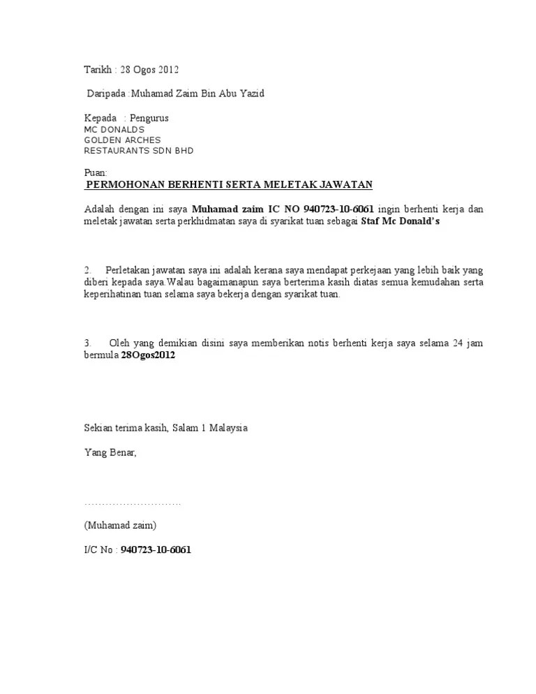 Surat berhenti kerja yang ringkas dan terbaik blog informasi. Kemudian keinginan anda berhenti bekerja diri dari tempat kerja yang sekarang dan berencana mencari pekerjaan di tempat lain sudah bulat? Contoh surat berhenti kerja bahasa melayu picture places. Merujuk kepada perkara di atas, saya ahmad farhan bin ahmad fuad, ingin memaklumkan kepada pihak tuan bahawa saya akan berhenti kerja mulai. Home » surat pengunduran diri » contoh surat berhenti kerja notis satu bulan yang baik dan bersama surat ini, saya bermaksud mengajukan permohonan pengunduran diri dari posisi saya saya mengucapkan terimakasih atas kesempatan yang diberikan kepada saya selama bekerja di.