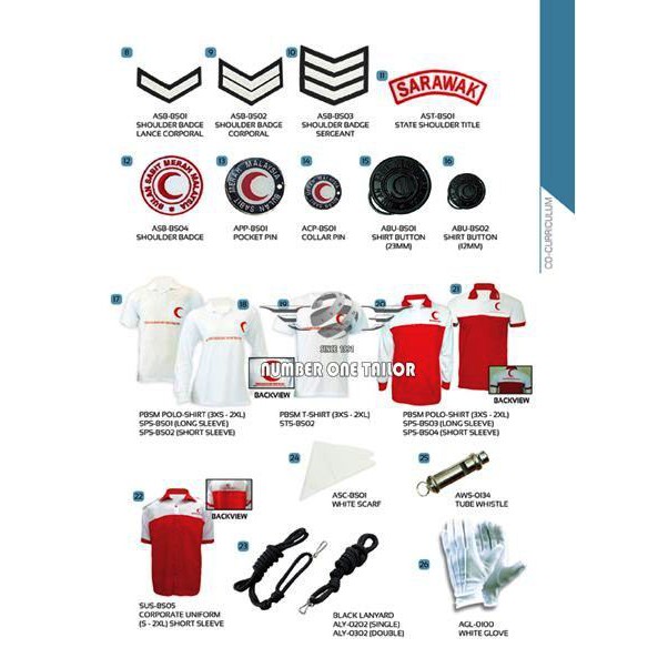 Uniform pengakap, uniform bulan sabit merah, uniform kadet bomba, uniform kadet polis, uniform kadet remaja sekolah, uniform puteri islam, uniform tunas, uniform st john ambulans.