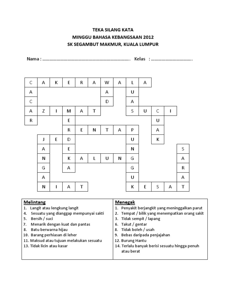 Teka silang kata dalam bahasa melayu adalah permainan puzzle yang menguji minda anda. Peraduan teka silang kata menang dan pandu 2015 akif via www.akifimtiyaz.com. Pelbagai teka silang kata kemerdekaan malaysia yang sangat via cikguayu.com. Myguru merupakan portal pembelajaran yang dibina selaras dengan keperluan silibus pelajar tahun 1 hingga tingkatan 5. Silang kata ting 2 terbaru (soalan dan jawapan) via www.scribd.com. Kami menyediakan hampir 214 koleksi silang kata yang pasti menarik perhatian dan menghiburkan anda! Bagai melepaskan batuk di tangga. Download silang kata malaysia 1.5 and all version history for android. Savesave teka silang kata sirah tahun 5 for later. Slideshare.net pelbagai teka silang kata bm tahun 1 yang sangat meletup. Kumpulan rpt pendidikan kesihatan tahun 2 yang dapat. Permainan perkataan terbaru daripada pencipta jom teka teki, anda boleh uji minda dengan main silang kata bahasa melayu.cara bermain adalah senang jek. Layari dan langgan modul pembelajaran.